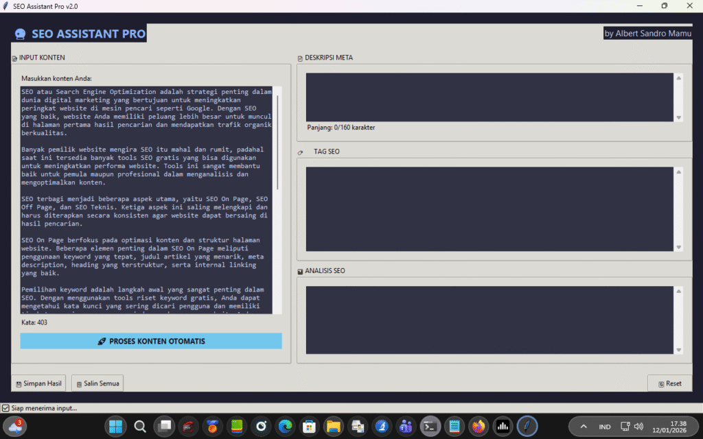 5. Klik tombol Proses Konten Otomatis, anda akan melihat hasil untuk Deskripsi Meta, Tag, dan lain-lain.